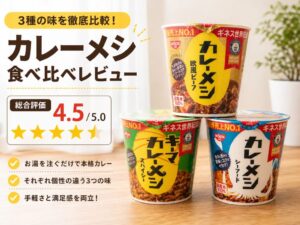 「カレーメシのおすすめが知りたい」「種類が多くてどれを買えばいいか分からない」——そんな方のために、日清「カレーメシ」シリーズの売れ筋3種「欧風ビーフ」「シーフード」「キーマスパイシー」を実際に食べ比べました。本記事では味の特徴・コク・辛さを5段階で評価し、初めての一杯から本気のストック選びまで、迷わず選べるよう徹底解説します。最後まで読めば、自分にぴったりのカレーメシが必ず見つかります。