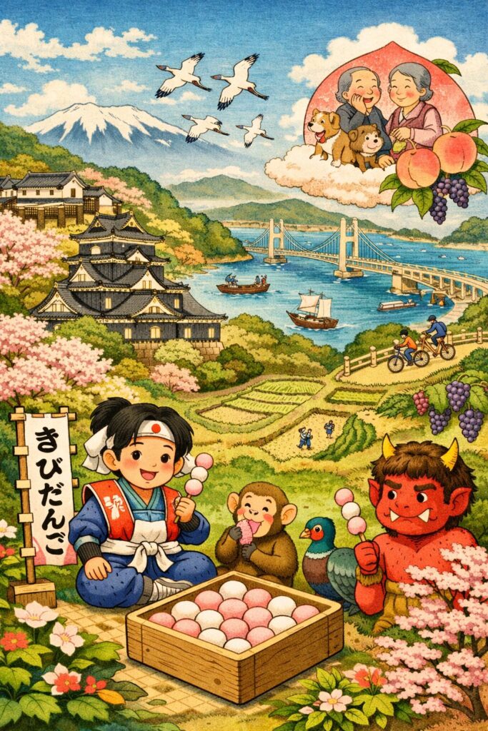 昔話「桃太郎」の中で、桃太郎はきびだんごを使って犬・猿・キジを家来にします。この物語と岡山県のつながりが、きびだんごを全国区の知名度に押し上げた大きな理由のひとつです。